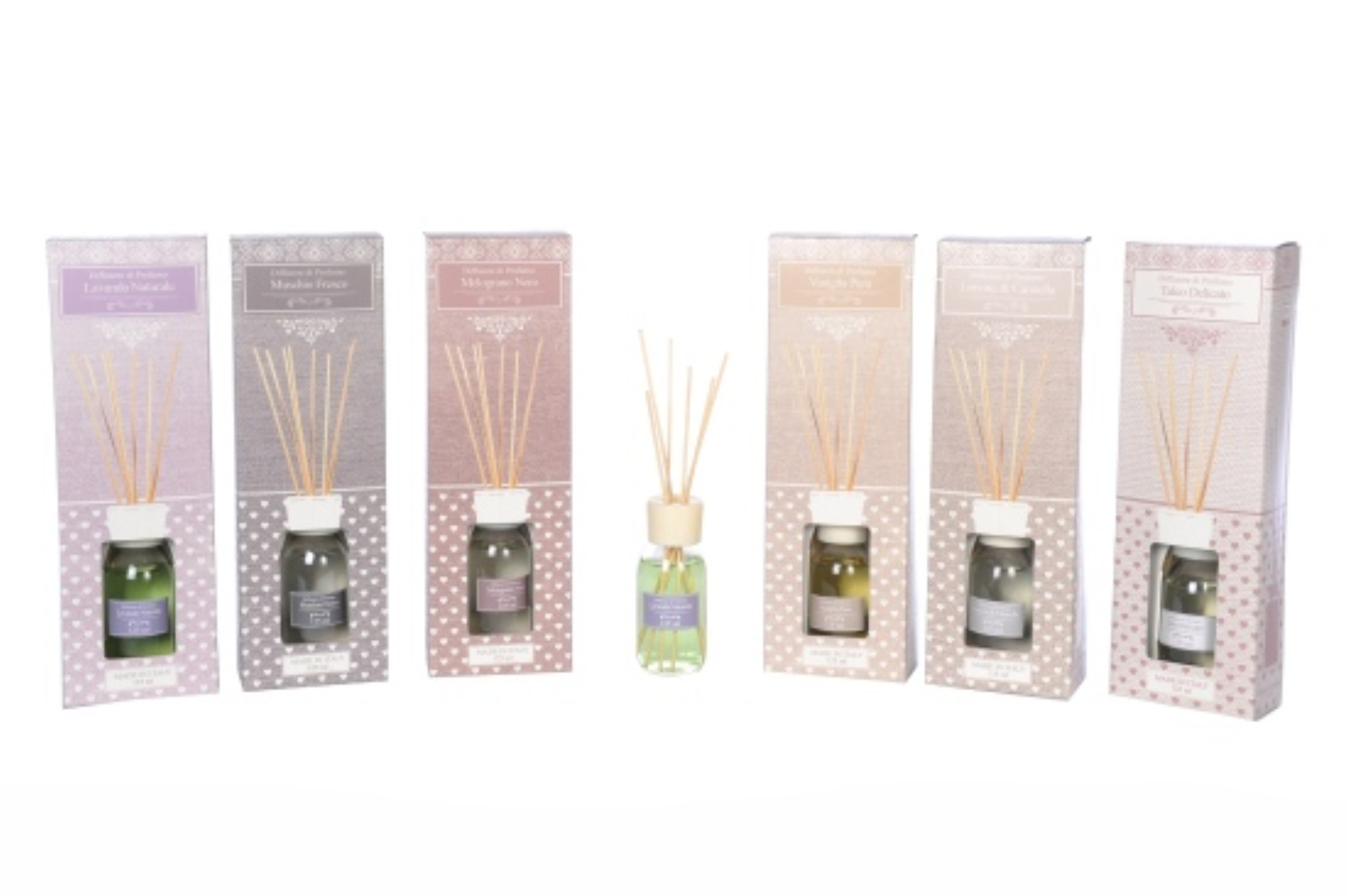 Raumduft Diffuser Lavendel, Moschus, Talkum, Vanille, Zitrone-Zimt, Granatapfel 125ml H31cm 6ass